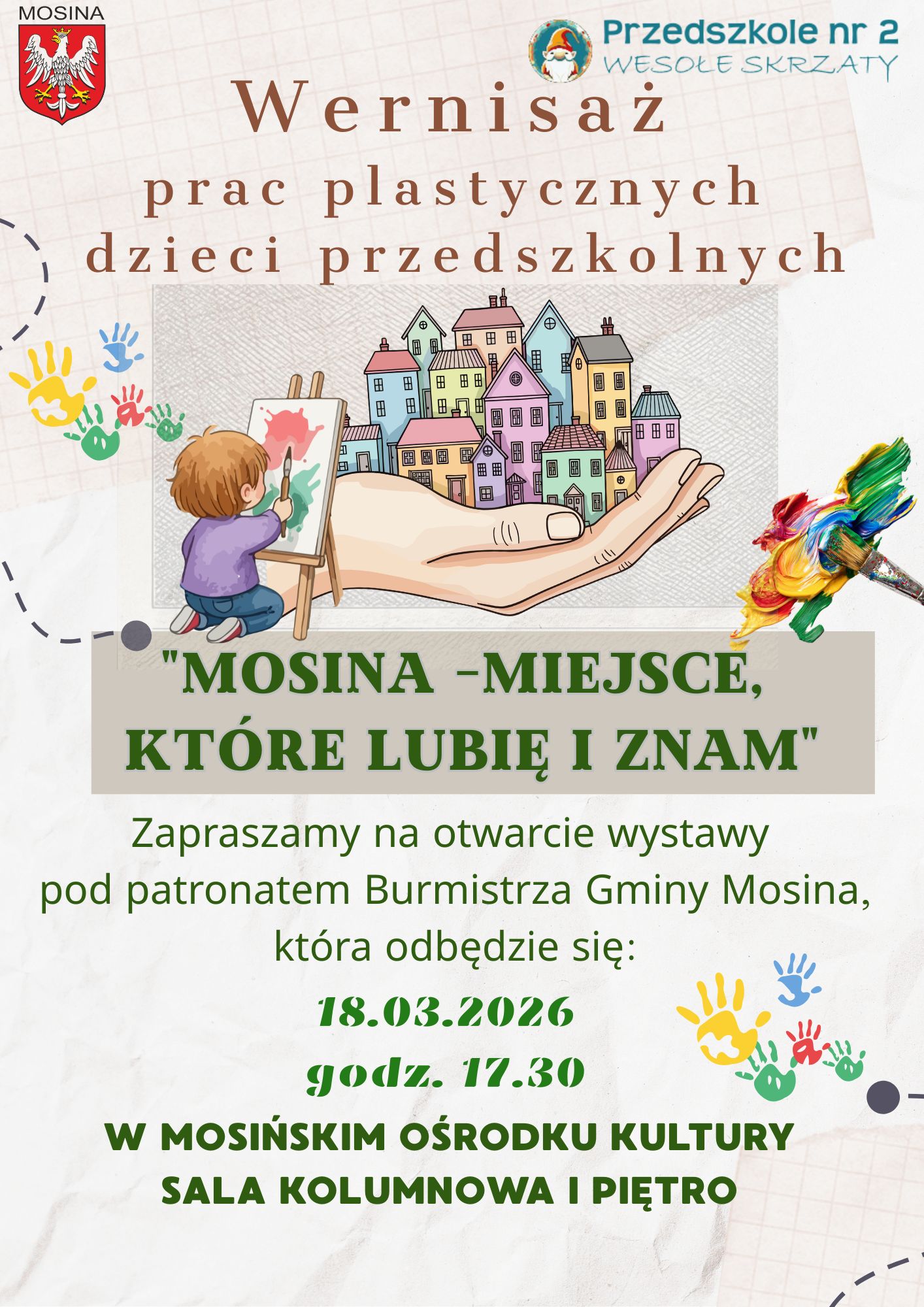 Już 18 marca zapraszamy na wyjątkowe wydarzenie! Serdecznie zapraszamy na wystawę prac konkursowych wykonanych przez dzieci przedszkolne w ramach Gminnego Konkursu Plastycznego: „Mosina – miejsce, które lubię i znam”. Podczas wydarzenia będzie można podziwiać niezwykłe, pełne kolorów i dziecięcej wyobraźni prace przedstawiające miejsca, które są ważne
