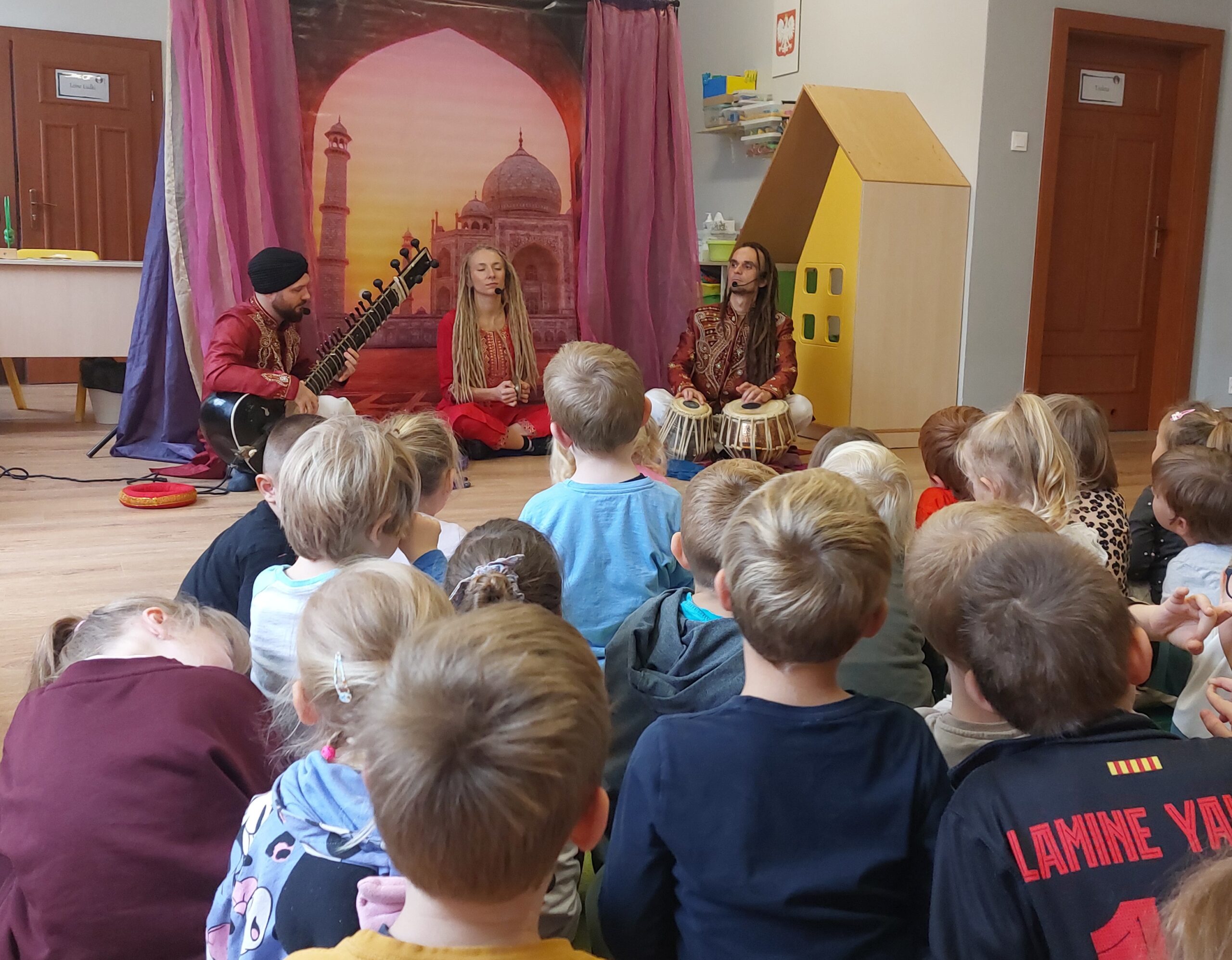 W środę 15 października odbyło się w naszym przedszkolu niezwykłe muzyczne spotkanie pt. „Holi, sari, ghaghra – hinduskie historie” – przygotowane przez Klub Małego Muzyka.