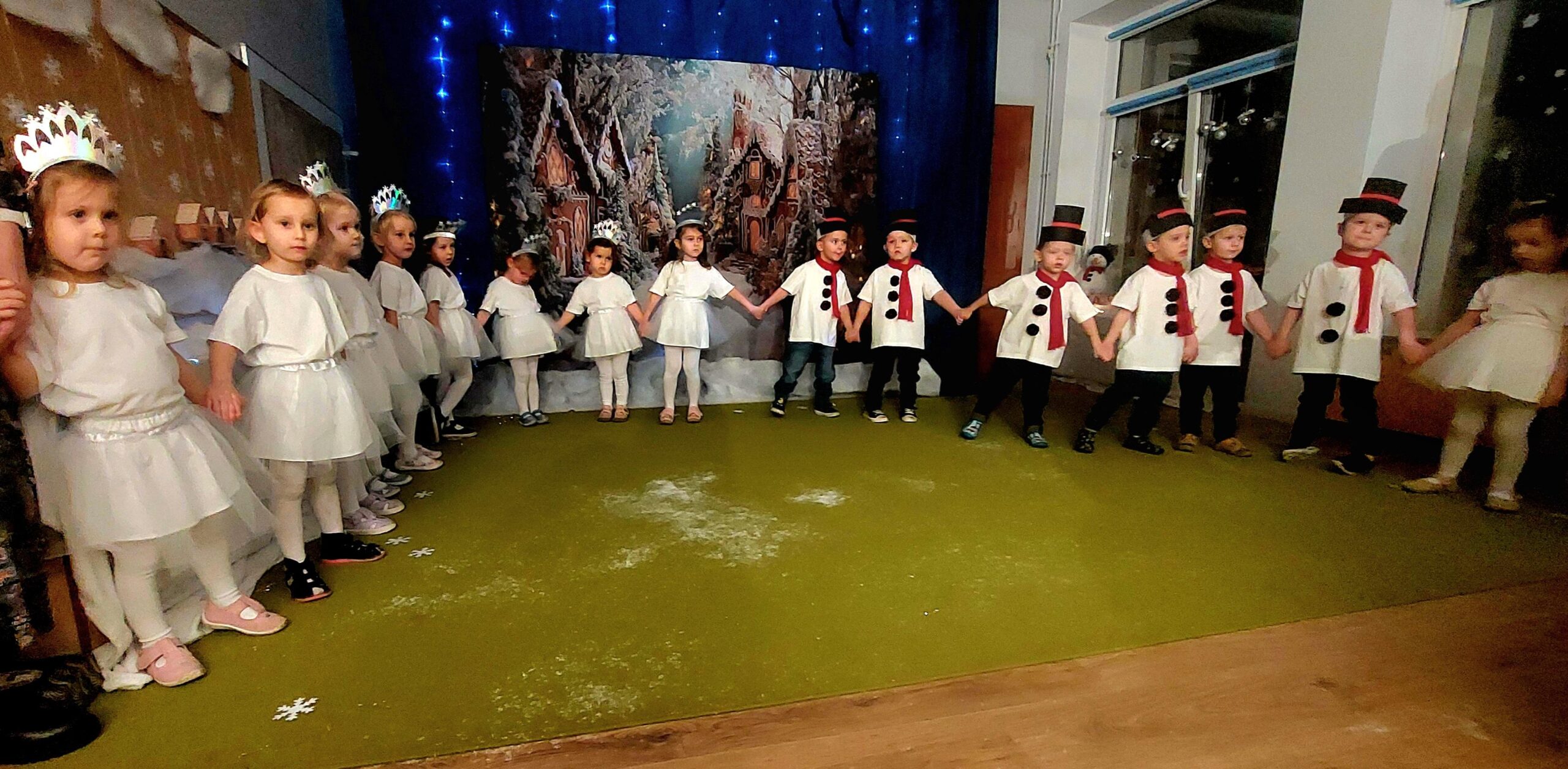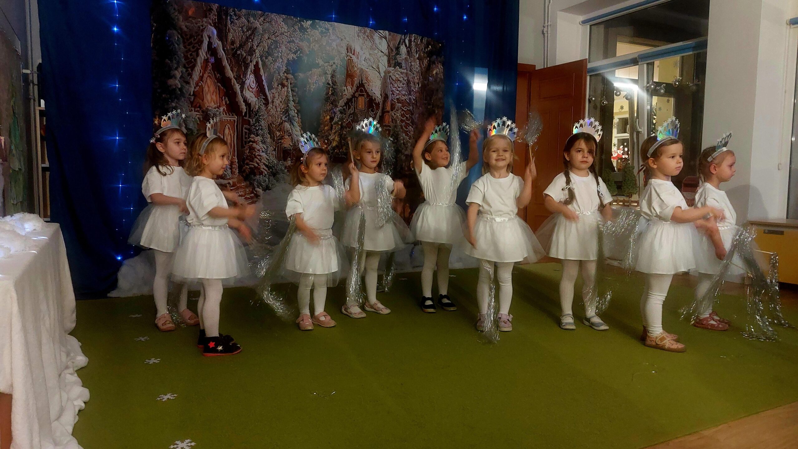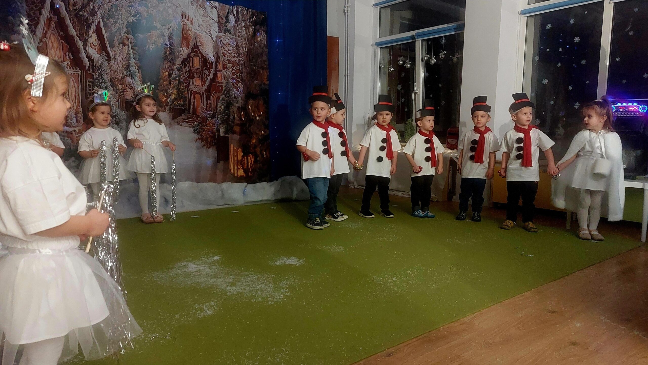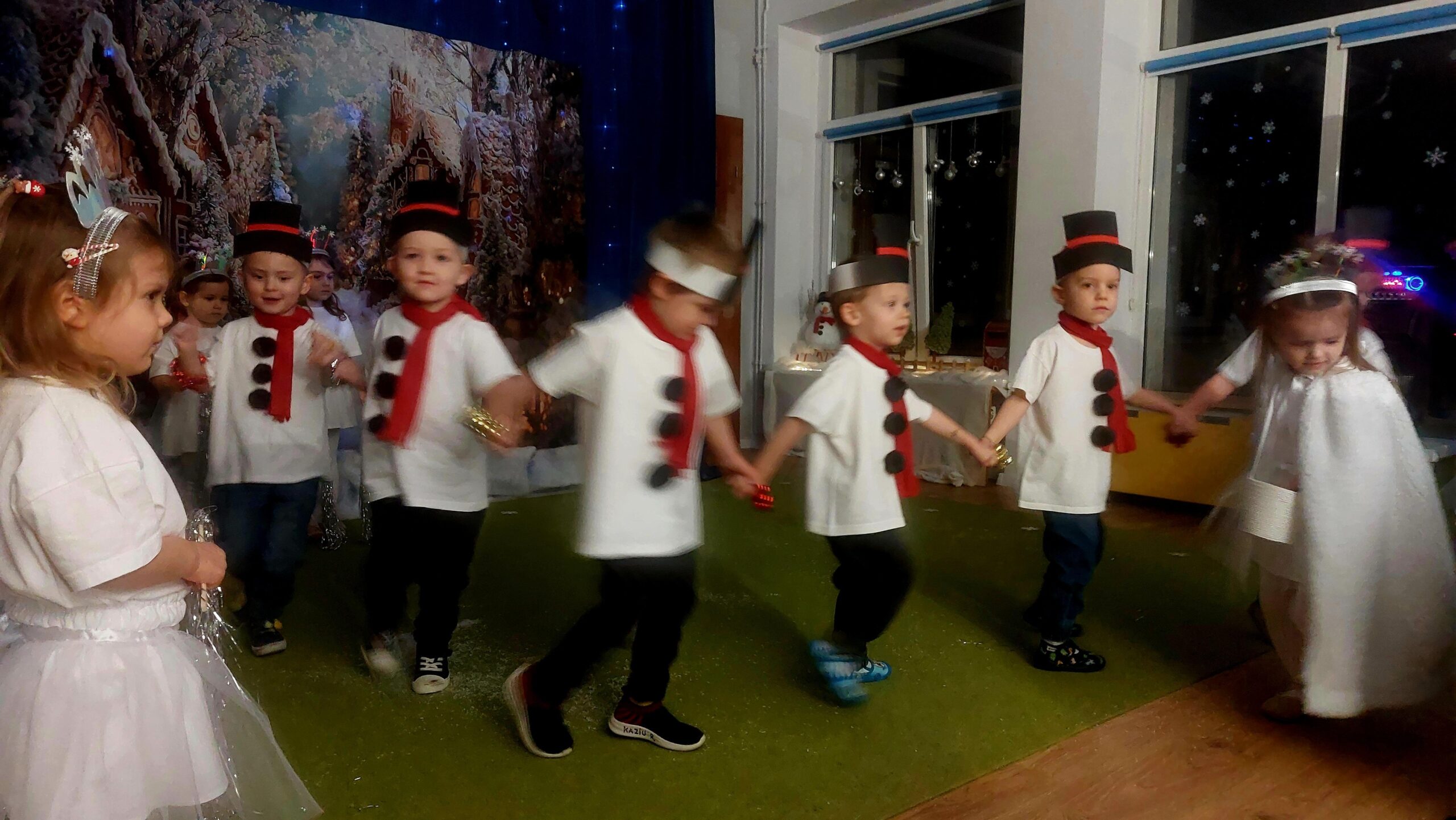 Podczas wyjątkowego, świątecznego występu nasze maluszki zaprezentowały się wspaniale. Urocze Śnieżynki zatańczyły swój zimowy taniec, a chwilę później Pani Zima zaprosiła na scenę wesołe Bałwanki. Dzieci z radością tańczyły i śpiewały, wprowadzając wszystkich w magiczny, świąteczny nastrój.