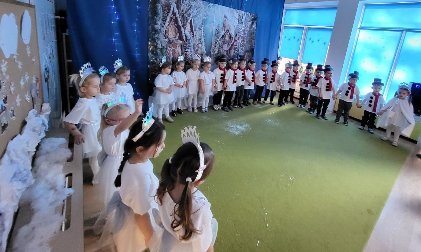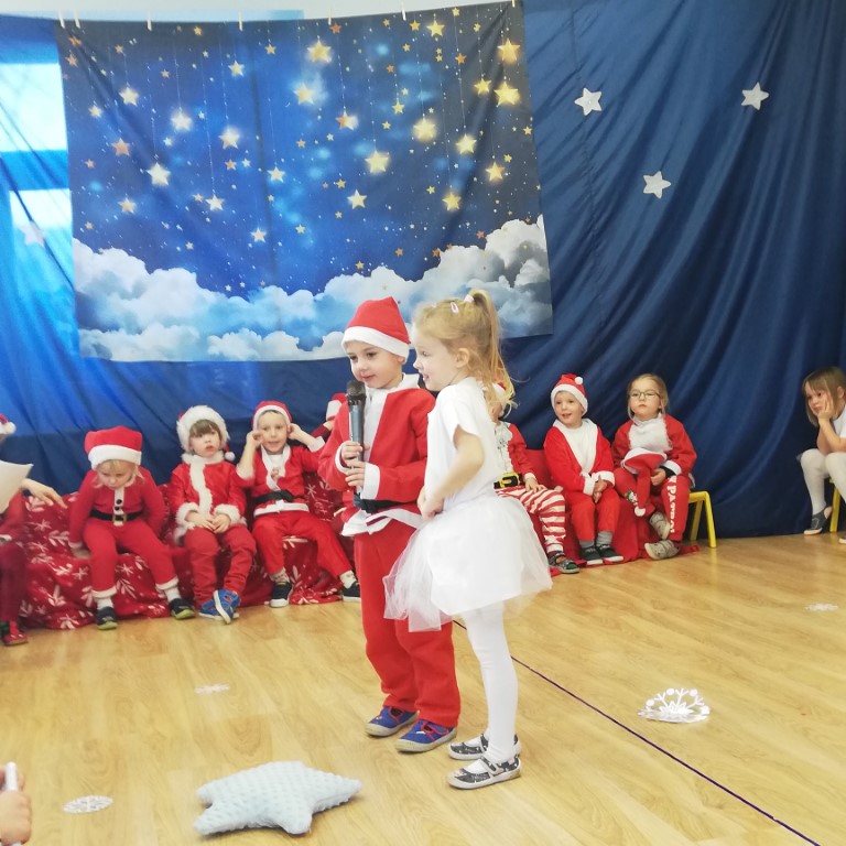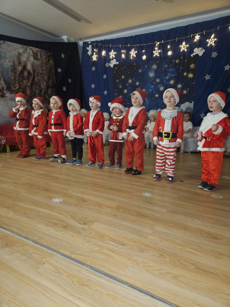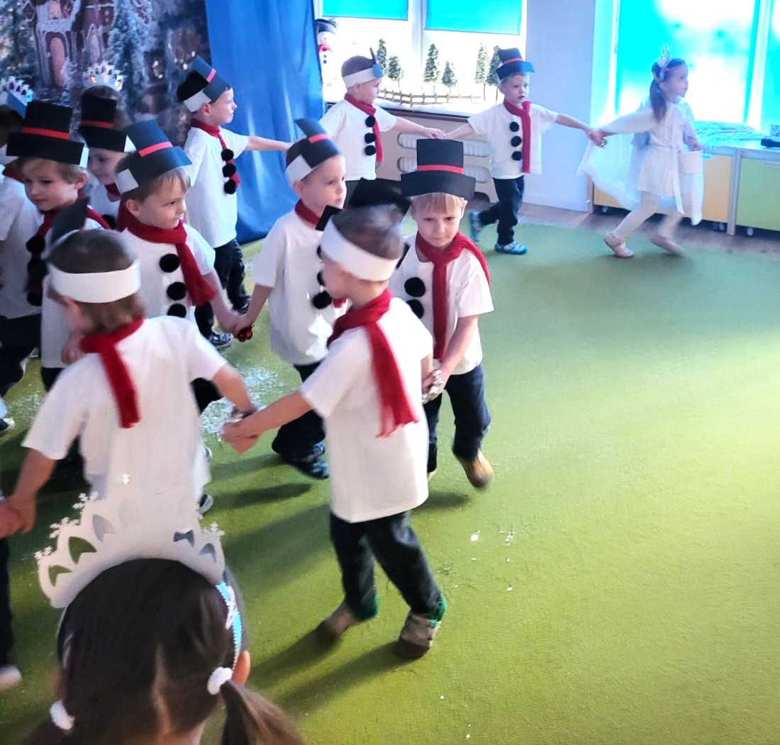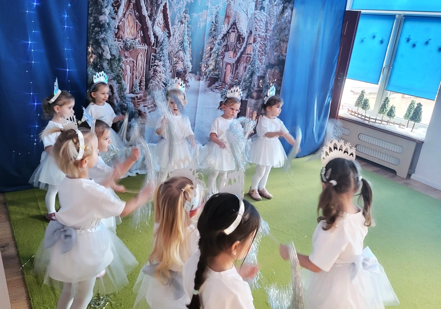 Podczas wyjątkowego, świątecznego występu nasze maluszki zaprezentowały się wspaniale. Urocze Śnieżynki zatańczyły swój zimowy taniec, a chwilę później Pani Zima zaprosiła na scenę wesołe Bałwanki. Dzieci z radością tańczyły i śpiewały, wprowadzając wszystkich w magiczny, świąteczny nastrój.