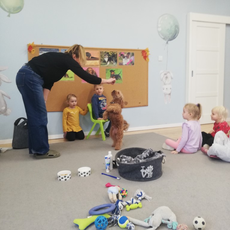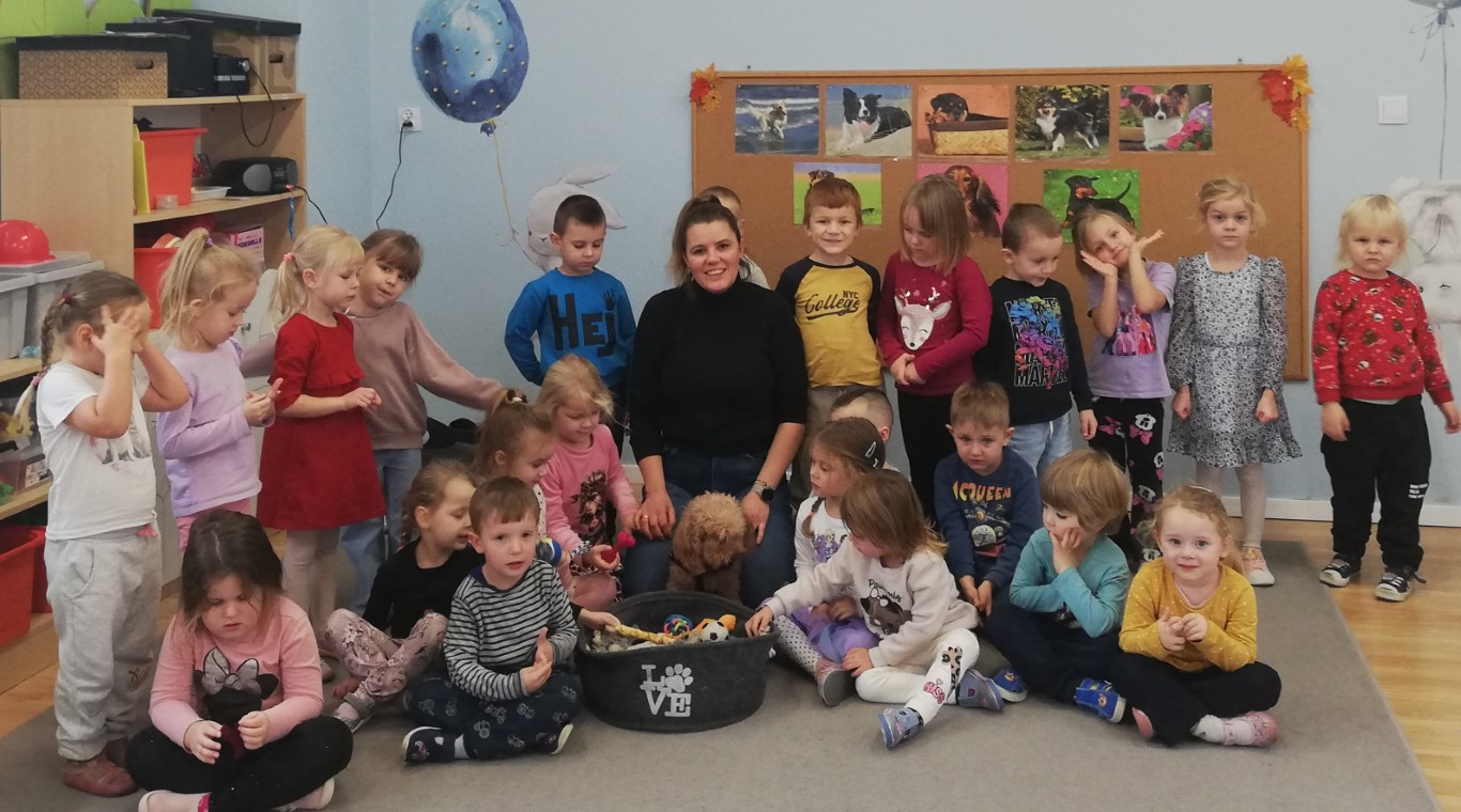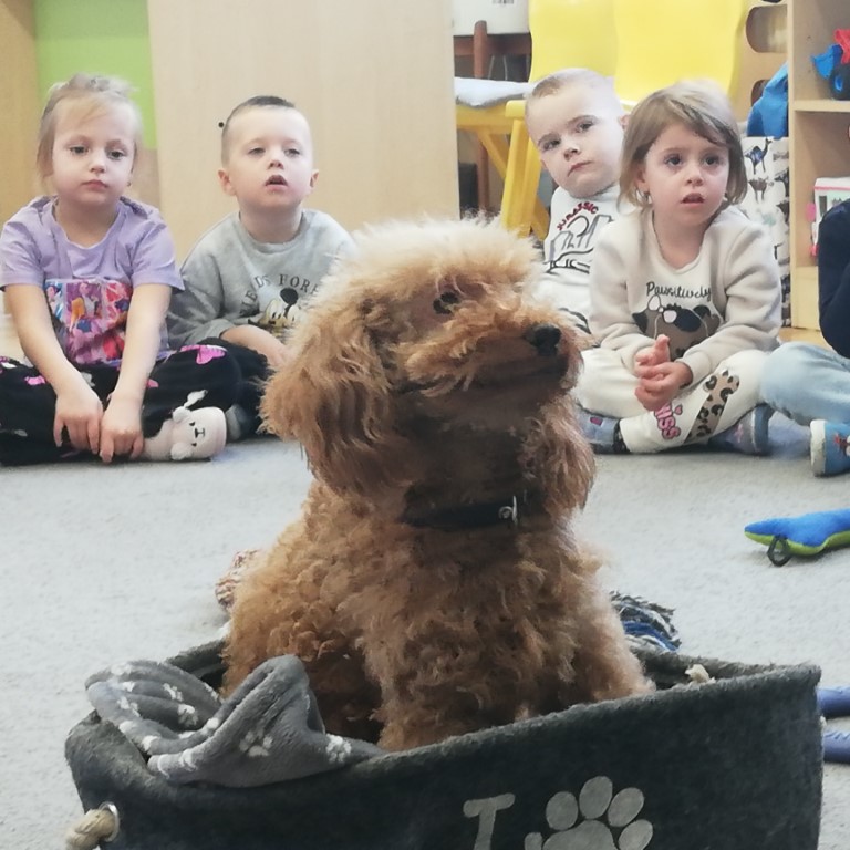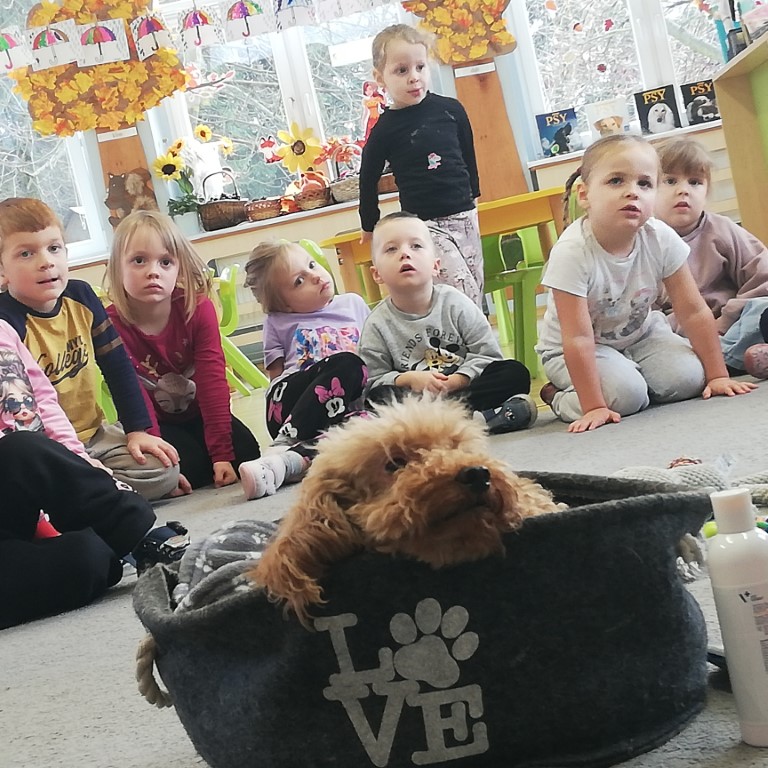Leśne ludki zaprosiły 17 listopada do przedszkola- wyjątkowego gościa. Tak , tak wyjątkowego, bo najlepszego przyjaciela człowieka. Był nim pudelek Badi wraz ze swoją ukochaną Panią Karoliną, która bardzo pięknie opowiedziała dzieciom o swoim pupilu. Dowiedziały się o przyjemnościach, ale i obowiązkach związanych z posiadaniem psa. Badi czuł się na sali Średniaków jak u siebie, był ufny, łagodny, spokojny, cieszył się sympatią przedszkolaków. Co ważne, pani Karolina uświadomiła gospodarzy, że nie wszystkie psy są tak przyjazne jak Badi. Dzieci dowiedziały się również, jak należy się zachowywać w stosunku do nieznanych psów, często niebezpiecznych. Badi na pewno na długo zagości w pamięci Leśnych ludków.