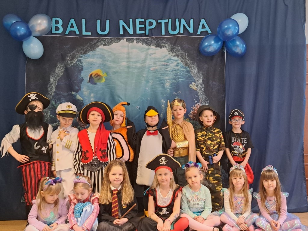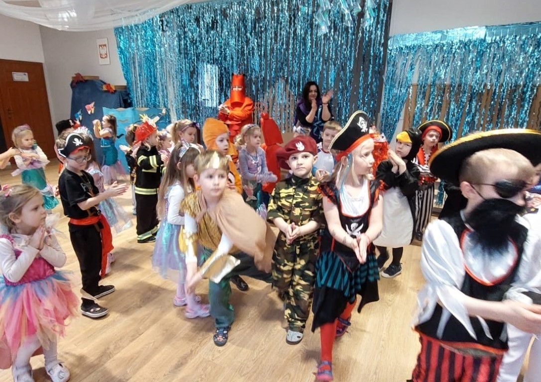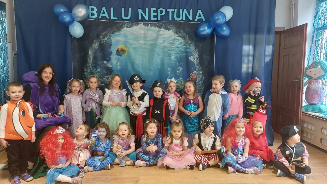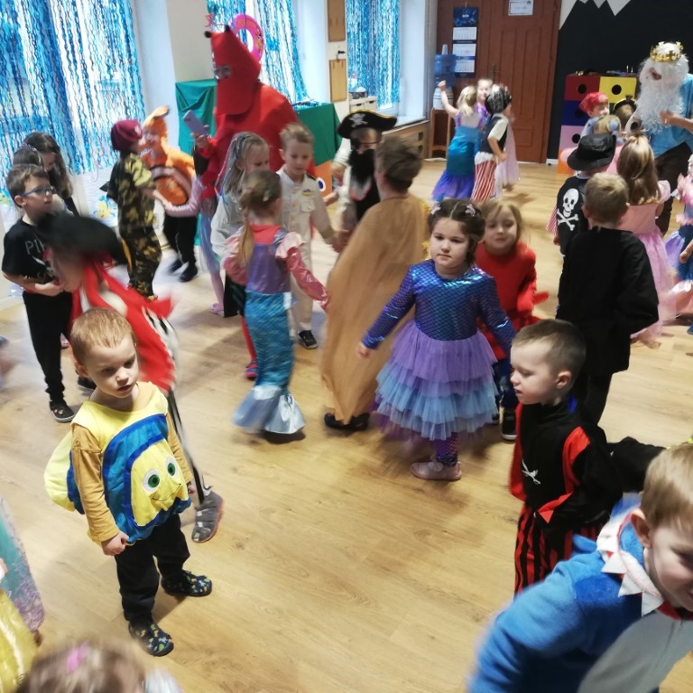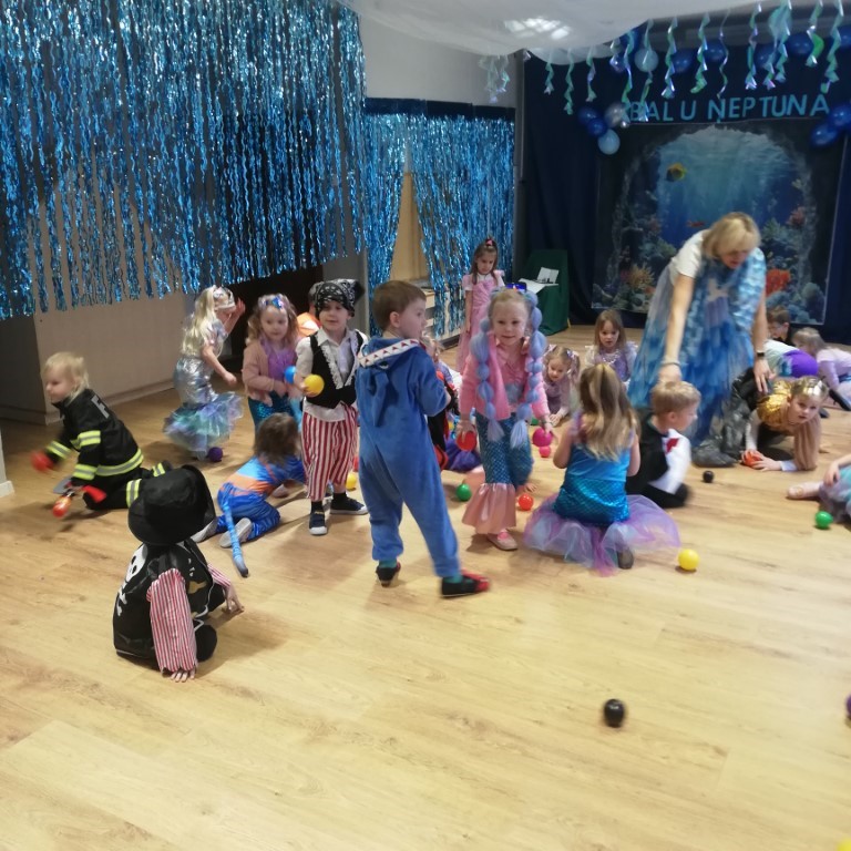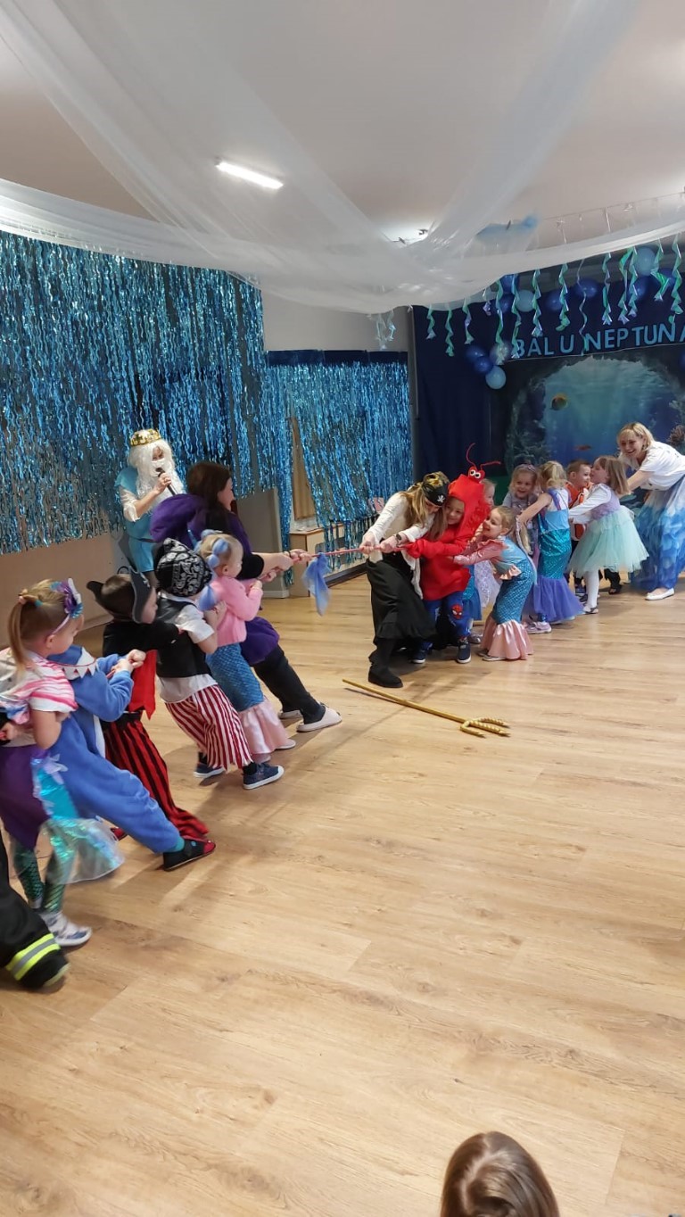Wesołe skrzaty na zakończenie Karnawału zostały zaproszone na bal do władcy mórz i oceanów – Neptuna. Goście musieli pojawić się w strojach nawiązujących do tematyki morskiej. Pojawiło się wiele znakomitości z morskich głębin- Nemo, Syrenki, Kraby, Ośmiornice, Rekiny a nawet Piraci. Oj, działo się tam działo! Między tańcami goście popłynęli w rejs statkiem, łowili ryby, karmili rekina, zbierali plankton. W międzyczasie na uczcie w pałacu króla, zaserwowano między innymi jabłkowe łódeczki. Odbyły się wyścigi żółwi i pirackie zawody. A co najważniejsze wszyscy uczestnicy balu bawili się wspaniale, słychać było śmiechy, śpiewy i okrzyki radości.