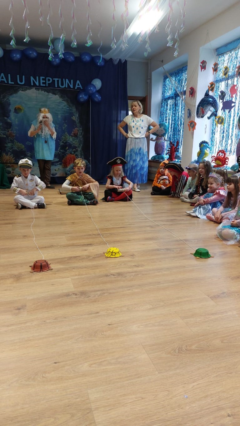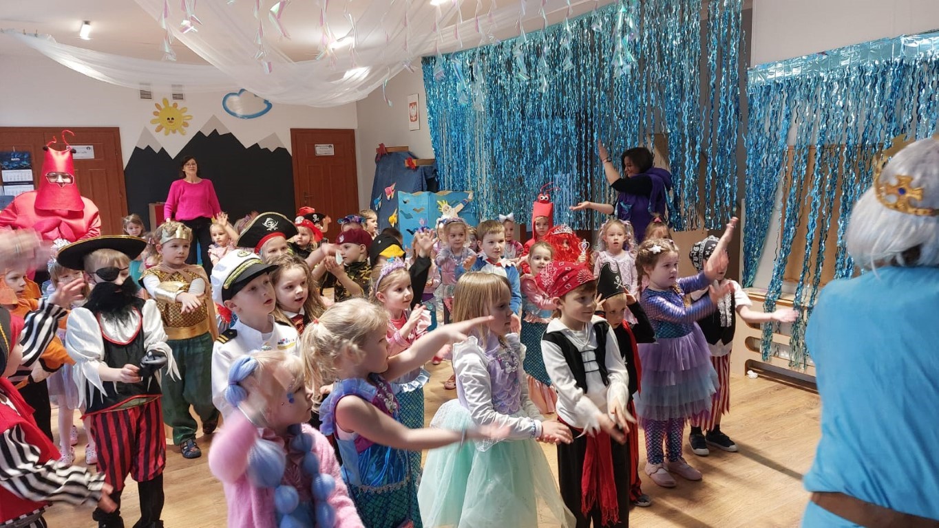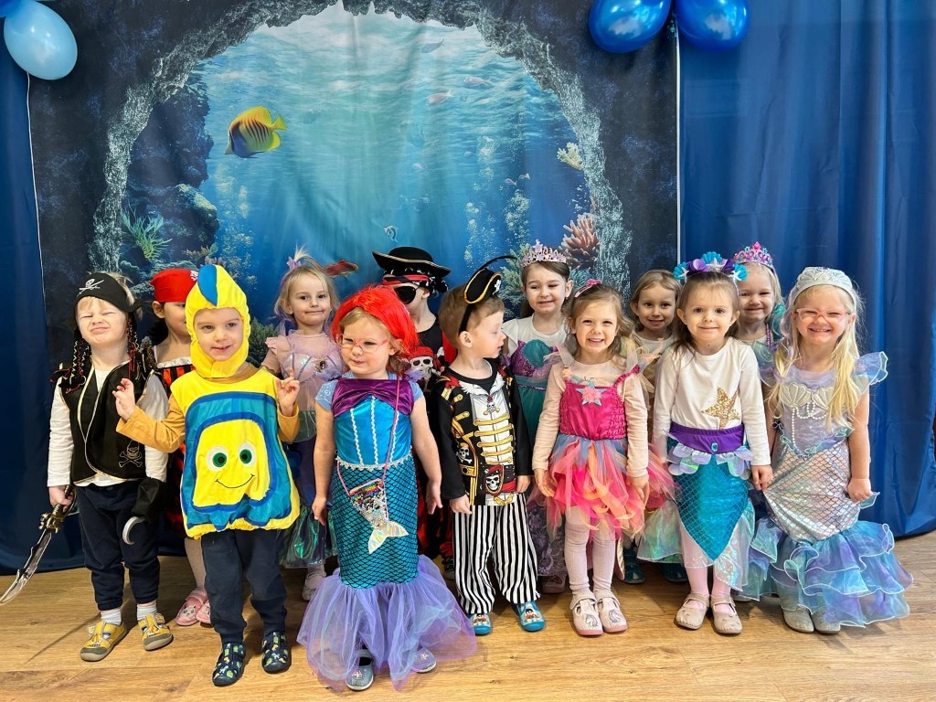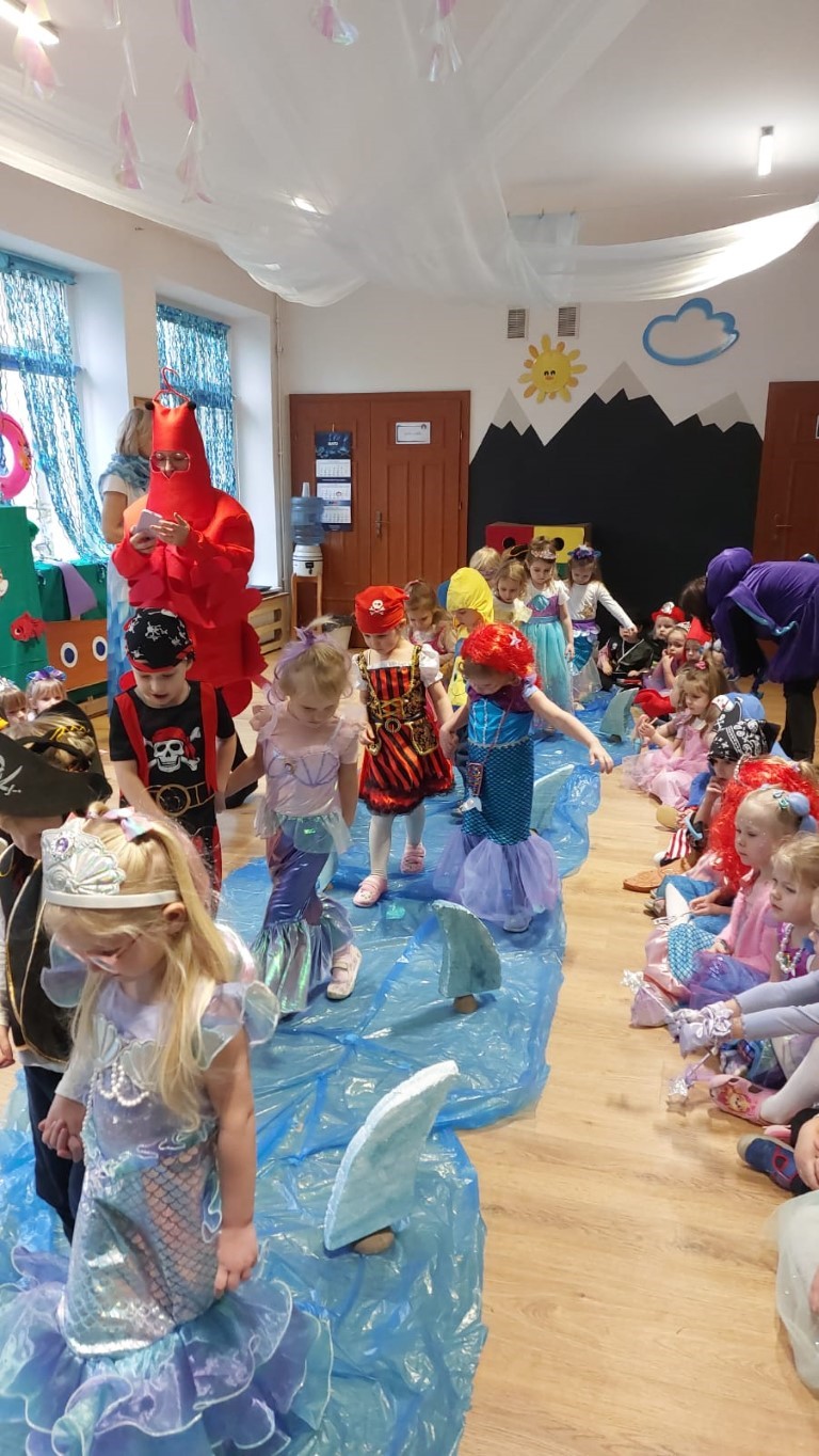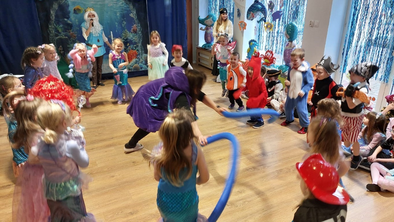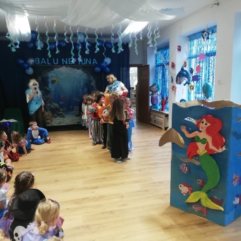 Wesołe skrzaty na zakończenie Karnawału zostały zaproszone na bal do władcy mórz i oceanów – Neptuna. Goście musieli pojawić się w strojach nawiązujących do tematyki morskiej. Pojawiło się wiele znakomitości z morskich głębin- Nemo, Syrenki, Kraby, Ośmiornice, Rekiny a nawet Piraci. Oj, działo się tam działo! Między tańcami goście popłynęli w rejs statkiem, łowili ryby, karmili rekina, zbierali plankton. W międzyczasie na uczcie w pałacu króla, zaserwowano między innymi jabłkowe łódeczki. Odbyły się wyścigi żółwi i pirackie zawody. A co najważniejsze wszyscy uczestnicy balu bawili się wspaniale, słychać było śmiechy, śpiewy i okrzyki radości.