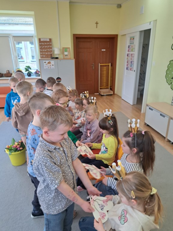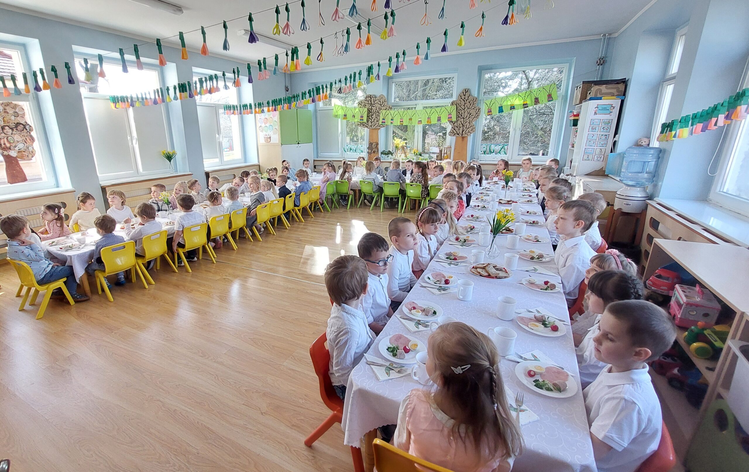 W naszym przedszkolu odbyło się radosne, wspólne śniadanie wielkanocne, w którym uczestniczyły wszystkie grupy. Dzieci zasiadły przy pięknie przygotowanych, świątecznych stołach, dzieląc się uśmiechem i wiosenną atmosferą.