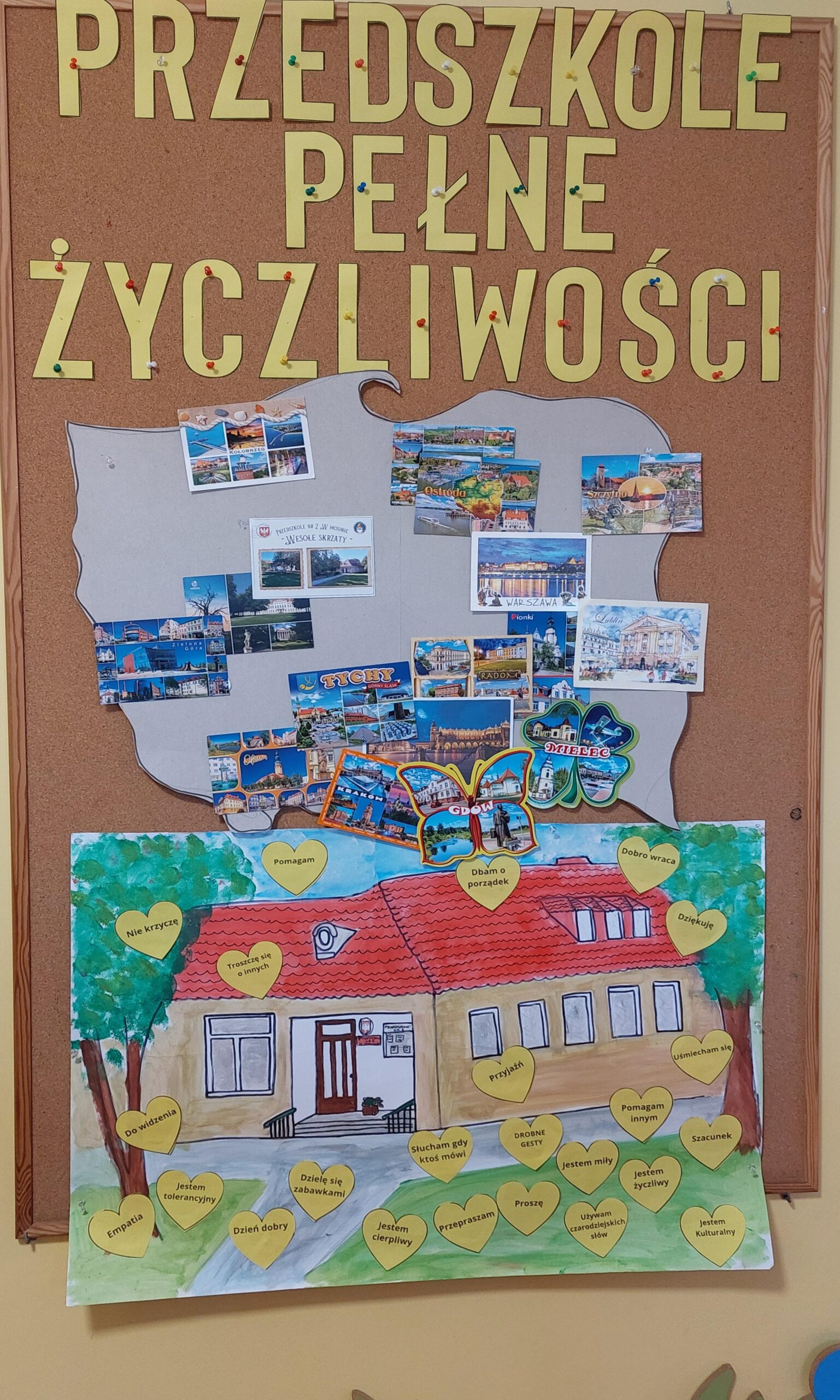 Przedszkolaki stworzyły także wspólne „przedszkole pełne życzliwości” – przyklejały serduszka na obrazku przedstawiającym nasze przedszkole opowiadając, czym dla nich jest bycie miłym i pomocnym. Dużo radości sprawiło również czytanie kartek od innych placówek, które otrzymaliśmy w ramach ogólnopolskiej wymiany pocztówkowej.