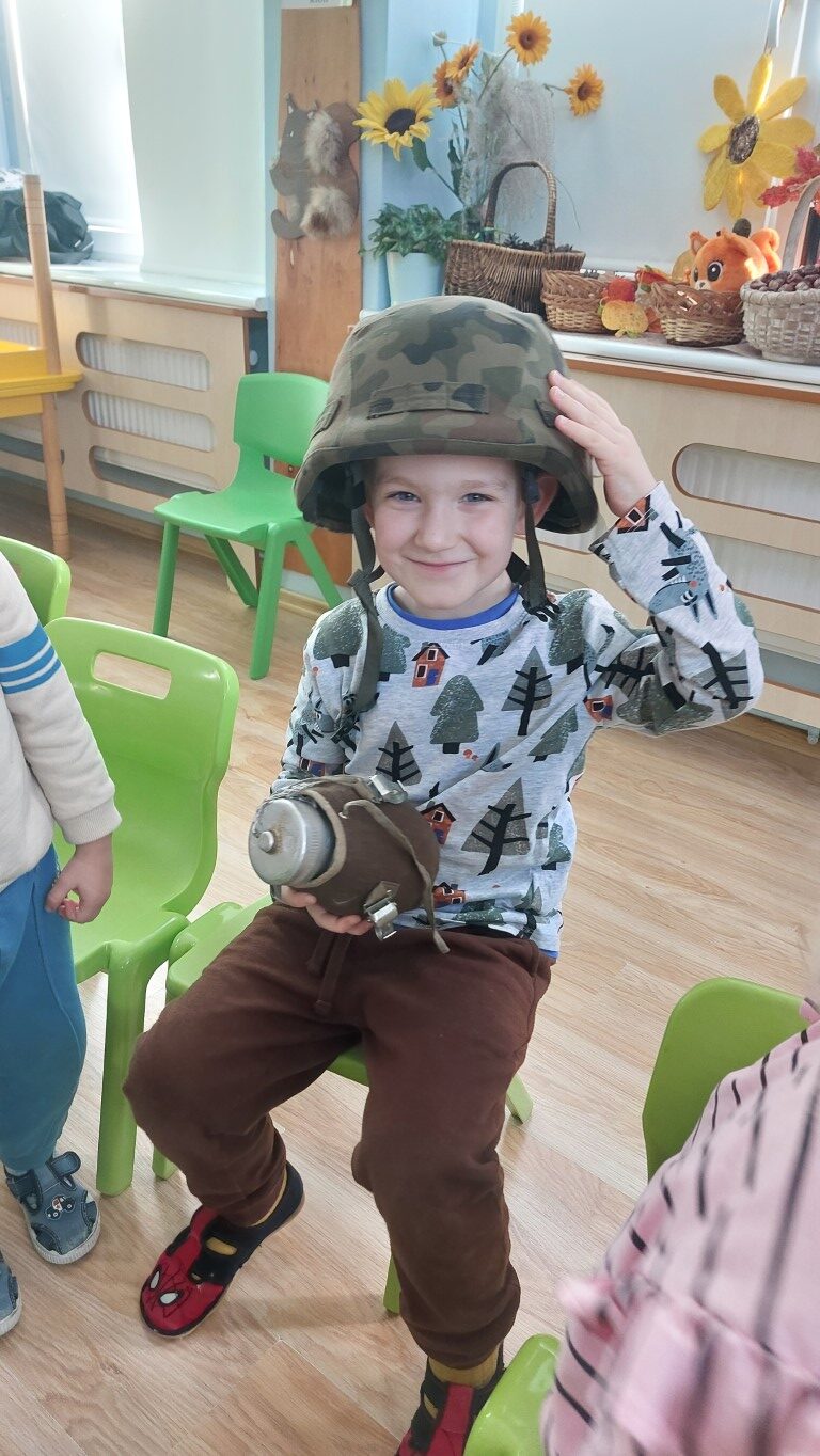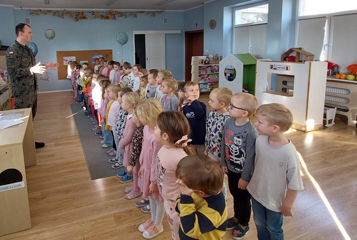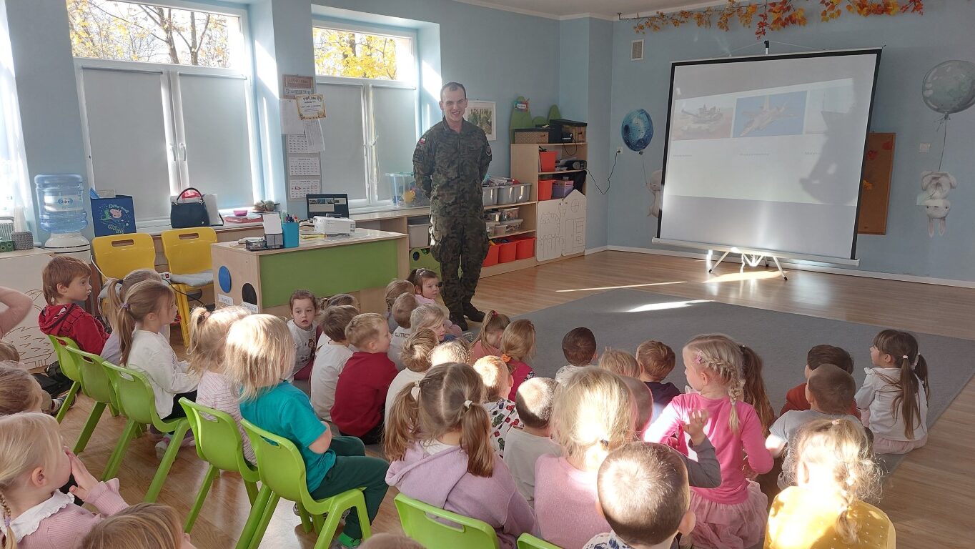 W naszym przedszkolu 4 listopada gościliśmy żołnierza z MJDOP w Babkach. Podczas spotkania z przedszkolakami, pan kpt. Sławomir opowiedział o swojej służbie, tak ważnej dla naszej ojczyzny. Przywiózł ze sobą różne elementy wyposażenia każdego żołnierza, tj. wyposażenie ochronne i mundurowe, maskę przeciwgazową, prowiant żołnierza. Wielką atrakcją dla dzieci było przymierzenie hełmu, kamizelki,, zakładanie maski przeciwgazowej. Z wielką uwagą słuchały, w jakich sytuacjach używa się wymienionych elementów. Pod okiem naszego gościa przedszkolaki spróbowały także swoich sił w musztrze wojskowej, ćwicząc komendy „baczność” i „spocznij”. Tematyka wojskowa zainteresowała zarówno chłopców, jak i dziewczynki. Spotkanie było doskonałą okazją, aby kształtować wśród najmłodszych postawy patriotyczne i szacunek dla osób, które dbają o bezpieczeństwo naszej Ojczyzny.