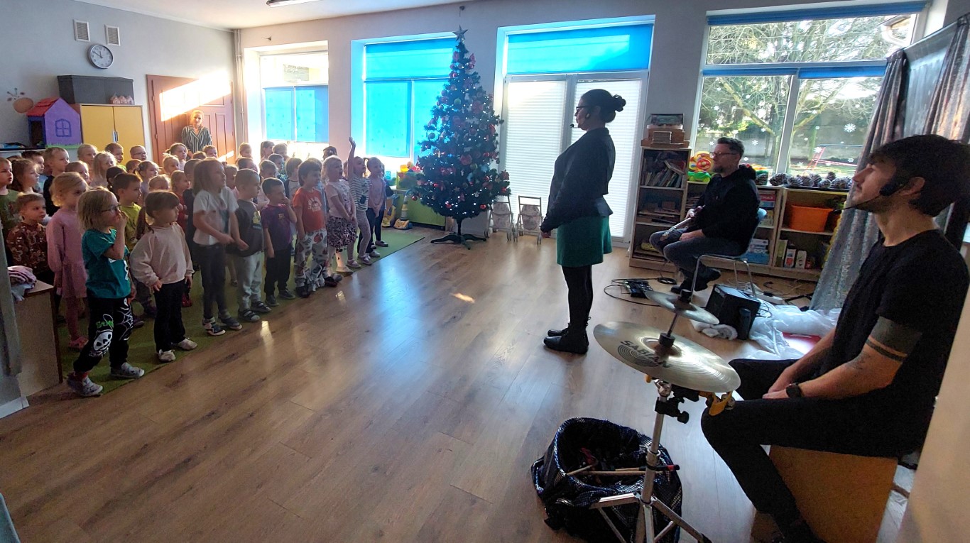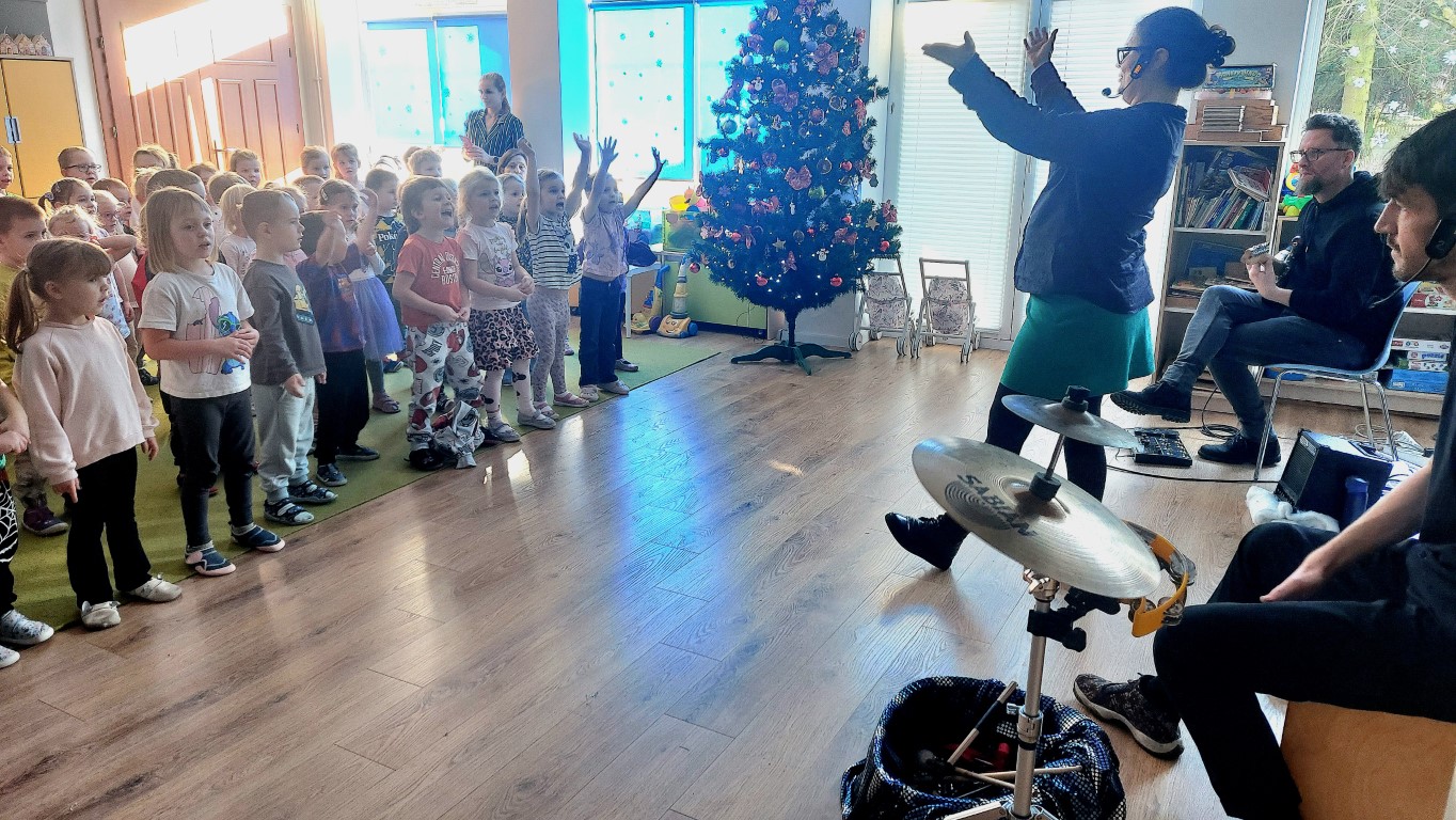 “Zamarznięta muzyka”, taki tytuł miało spotkanie z Klubem Małego Muzyka. Zadaniem dzieci było obudzenie zamarzniętej Melodii. Słuchaliśmy gry na gitarze elektrycznej i perkusji oraz dźwięków jakie wydają różne instrumenty. Przypomnieliśmy sobie piosenkę Jest taki dzień i inne utwory o tematyce zimowej. Wspólnie z obudzoną Melodią wprowadzeni zostaliśmy w klimat Świąt Bożego Narodzenia. Spotkanie zakończyło wspólne odśpiewanie kolędy Przybierzeli do Betlejem oraz Cicha Noc.